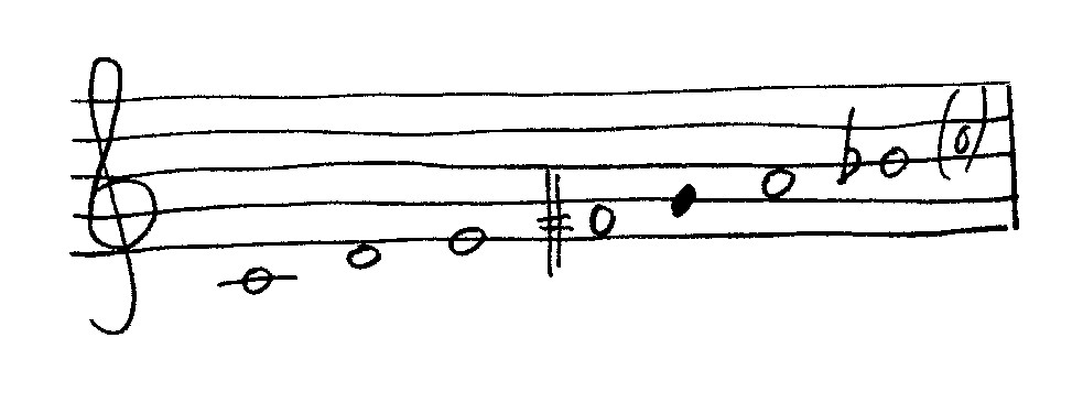 Aus diesem sechstönigen Akkord erbibt sich eine Skala , deren siebter Ton - die im Akkord fehlende Quinte, die sich als nächste oben angefügte Quarte ergeben würde - ergänzt wurde. Diese Tonleiter besteht, wie herkömmliche diatonische Tonleitern, aus Ganztonschritten und zwei Halbtonschritten. Sie ist deshalb auf alle chromatischen Töne transponierbar (im Gegensatz zu beispielsweise von Debussy verwendeten Ganztonleitern).